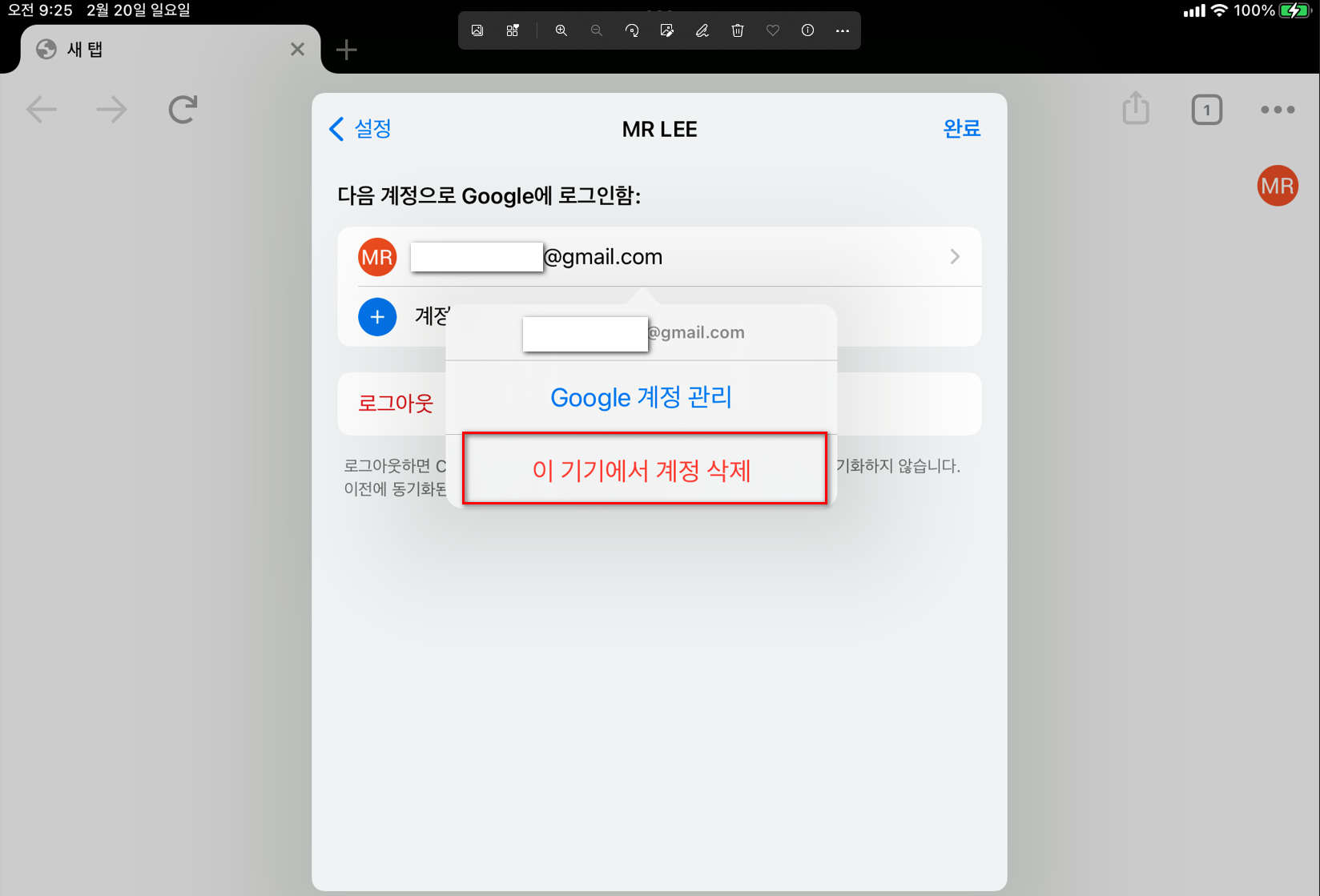 4) 삭제할 계정을 선택하면 팝업 메뉴가 보이고 "이 기기에서 계정 삭제"를 클릭하여 계정을 삭제한다.
