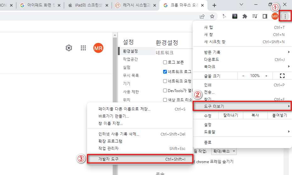 1) 다음 그림의 경로처럼 개발자 도구를 오픈한다. 또는 단축키 (Ctrl+Shift+i)로 간단히 열수 있다.