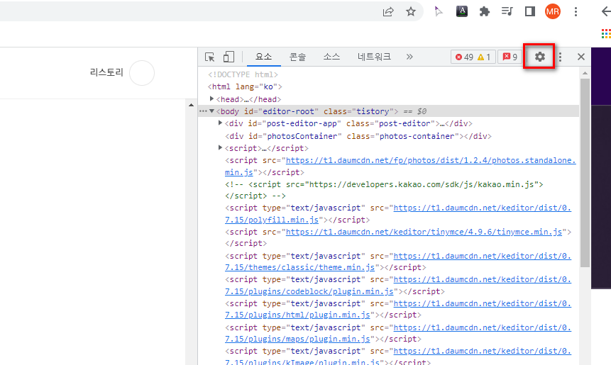 2) 새로 나타난 창에서 아래 그림처럼 빨간색 사각 모양안의 톱니바퀴 설정 버튼을 클릭한다.