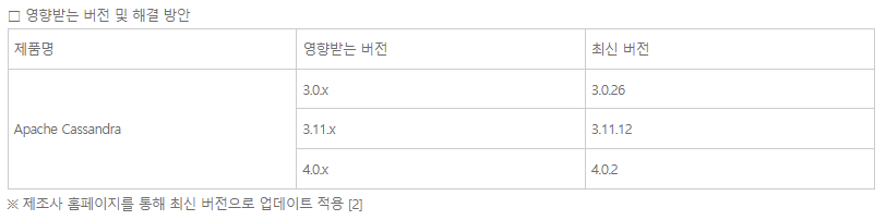 o Apache Cassandra에서 원격 코드 실행이 가능한 취약점이 발견됨에 따라 낮은 버전을 사용 중인 시스템 사용자는 최신 버전으로 업데이트 조치 권고[1]