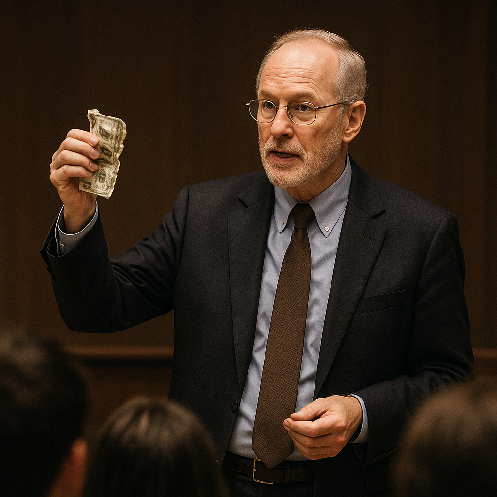 어느 대학교 강의실, 한 교수가 강단에 올라와 조용히 지폐 한 장을 꺼냈습니다.