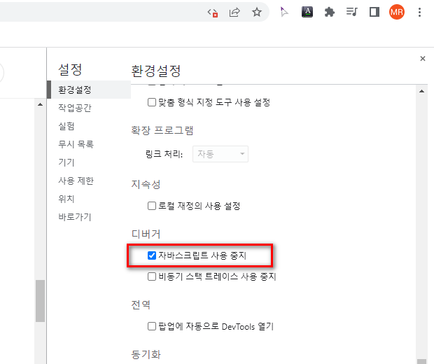 3) 설정 화면에서 "디버거" 항목으로 이동하여 "자바스크립트 사용 중지"에 체크를 한다.