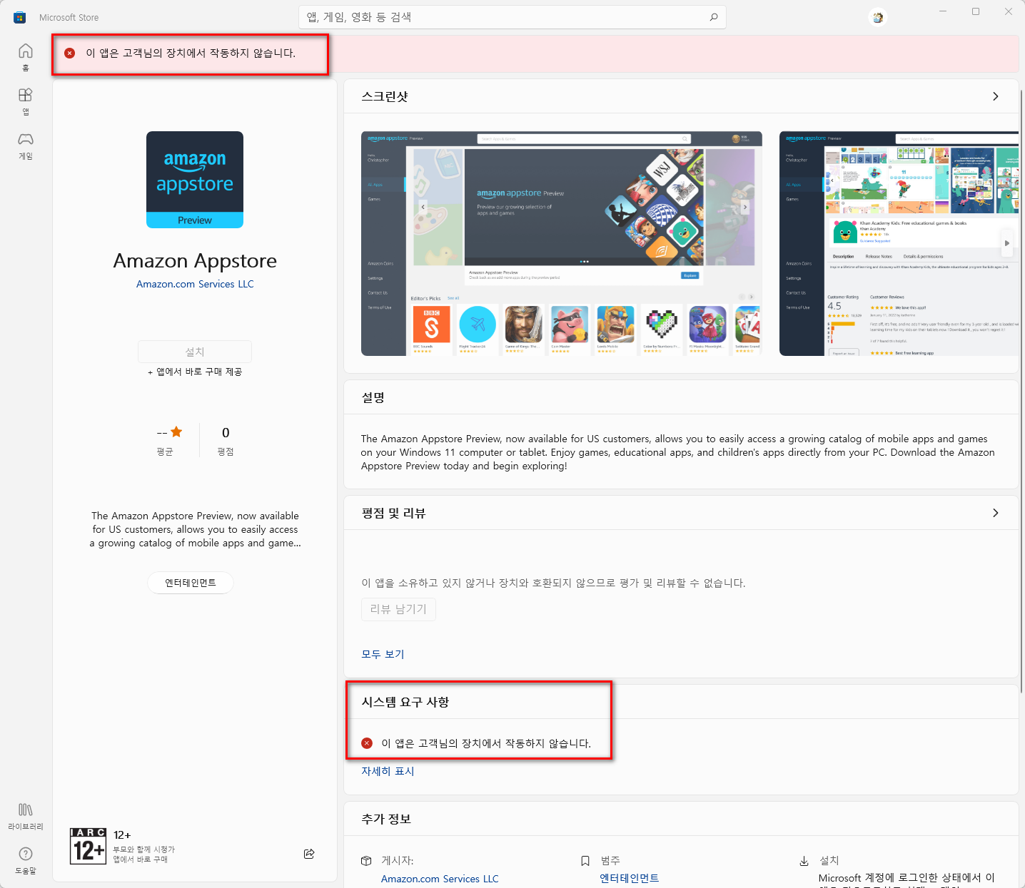 결론적으로는....지금 내 윈도우(한국)에서는 아마존 앱스토어 인스톨이 안된다!!!!