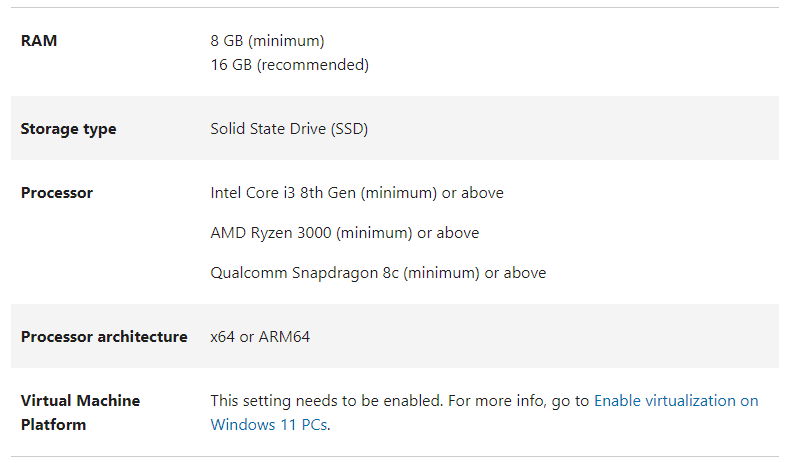 장치에 Windows 11이 설치되어 있는지 확인하십시오. PC에 필요한 최소 요구 사항을 보려면 Windows 11 사양 및 시스템 요구 사항 으로 이동하십시오 . 장치에서 모바일 앱을 사용하려면 PC도 다음 요구 사항을 충족해야 합니다.